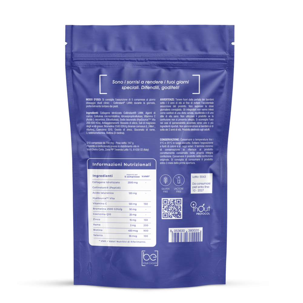Acido Ialuronico, Biotina, Bromelina, Coenzima Q10, Rame, Selenio, Vitamine C/E, Zinco